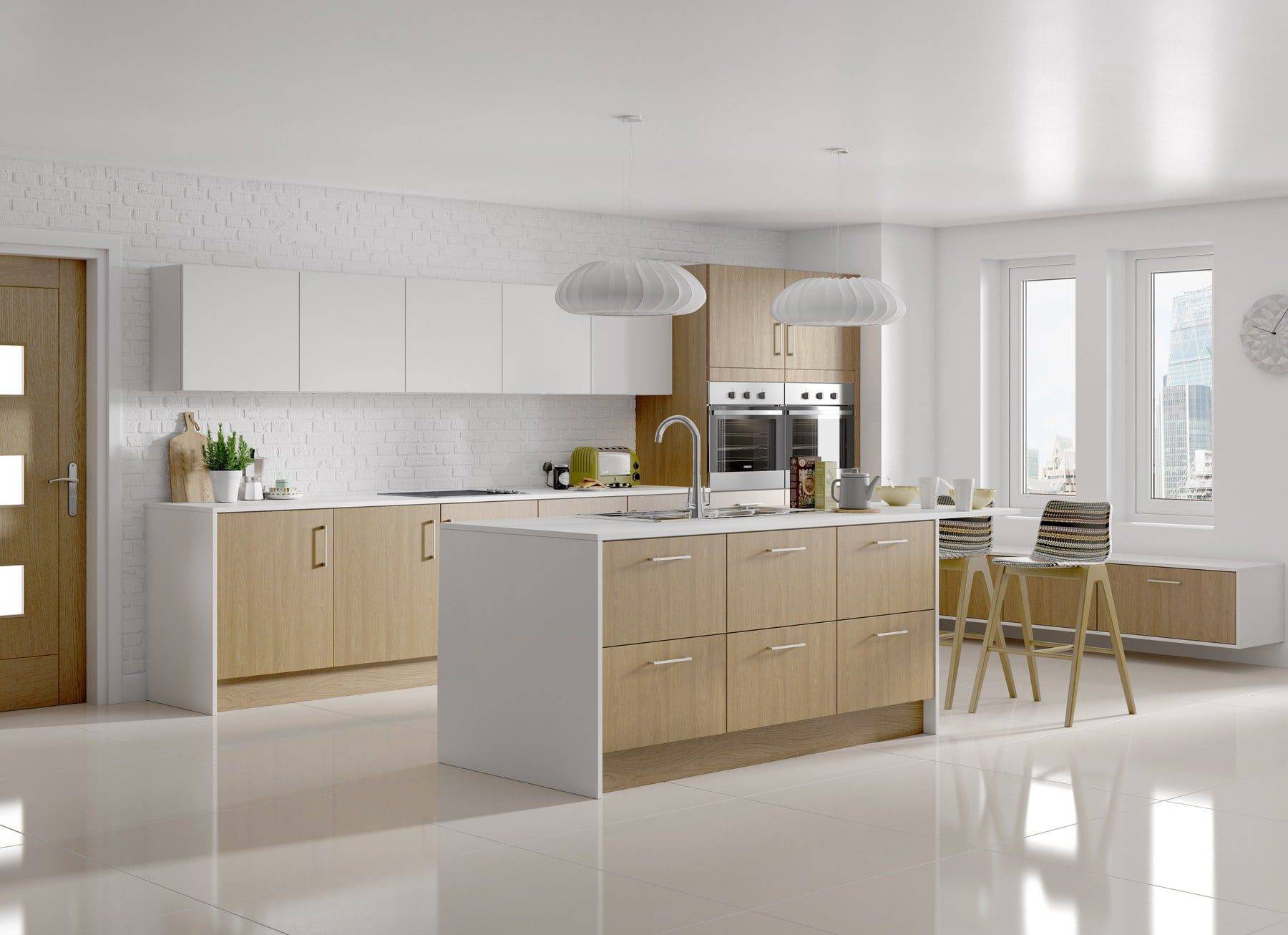 Bold Kitchens have a wide range of light coloured doors in gloss, matt, stone, wood, and shaker. Choose from white, brilliant white, cream, taupe, light-grey, as well as calacatta stone, light oak, beech, maple, sand-oak and more.