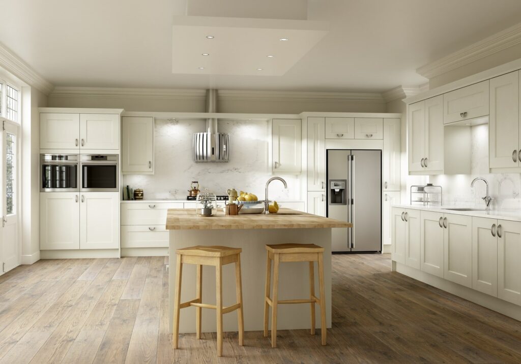 Whilst traditional kitchens are very beautiful, traditional doesn’t need to mean ‘old-fashioned’…long gone are the days when Gingham curtains constituted a country kitchen! Instead we combine ultra-modern, integrated appliances with traditional elements to create the perfect, stylish country kitchen. Our painted wood kitchen cabinets are available in many modern colours such as the Pearl grey, Lava grey, Graphite – and very on trend – Velvet Blue kitchen door. These contemporary colours will instantly modernise this more traditional style of kitchen door. Blending modern with traditional elements within a kitchen is often referred to as a Transitional kitchen style. Other ways you can enhance this look further include incorporating a metallic tiled splashback, accessorising with on trend materials such as copper, rose gold and bronze, or you can even colour-match your handles to your chosen door colour, creating a chic and minimal modern look.
